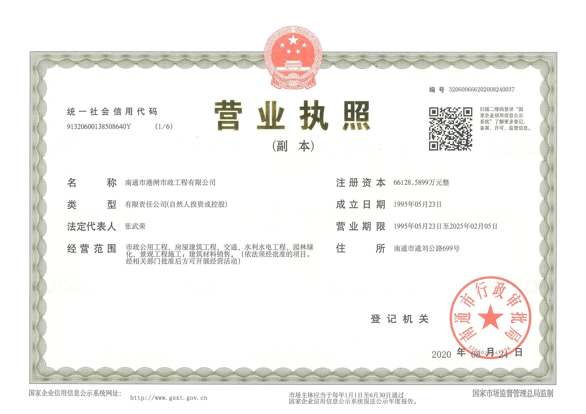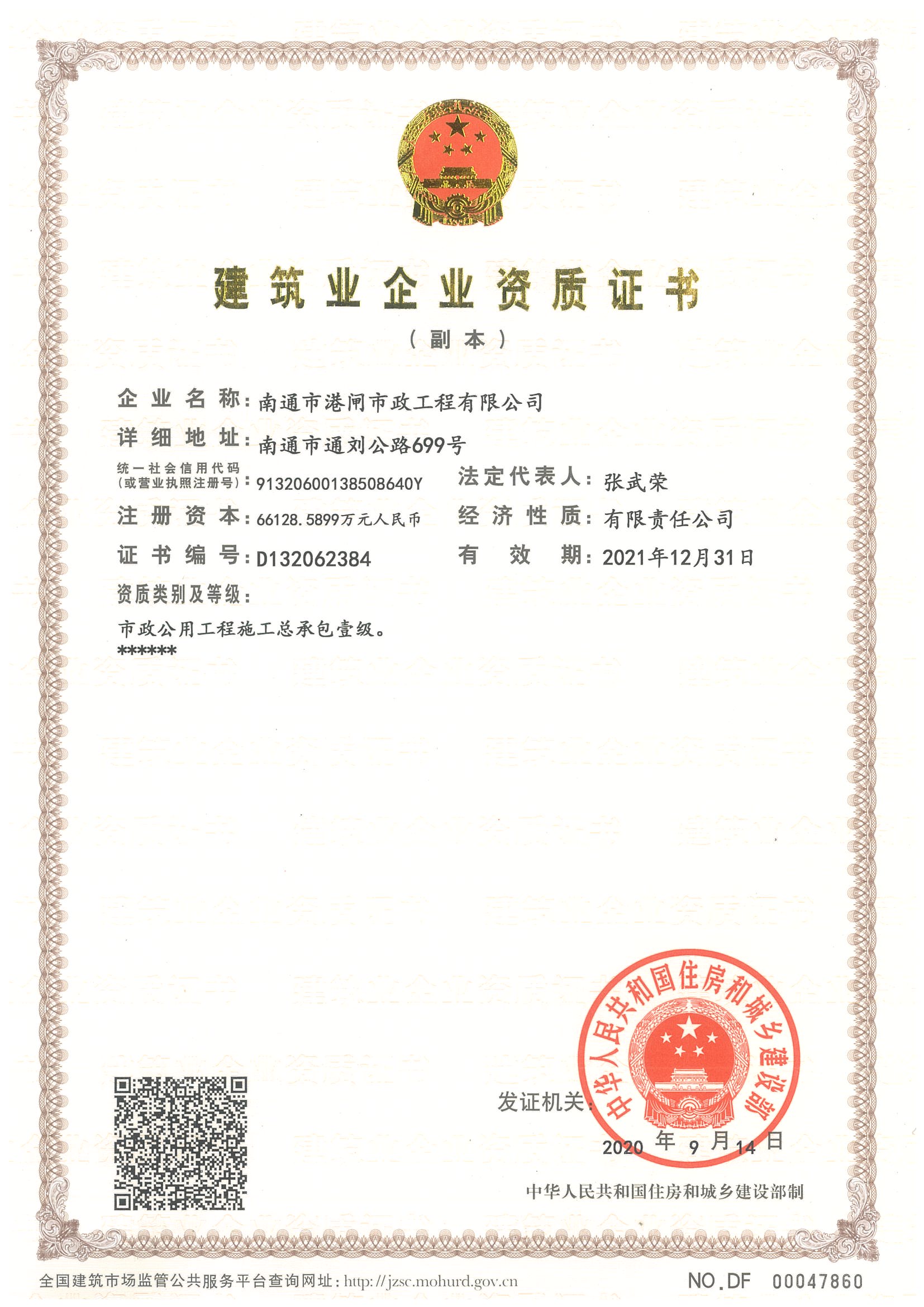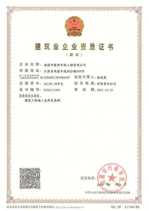 建筑業(yè)企業(yè)資質(zhì)證書(市政公用工程壹級(jí))